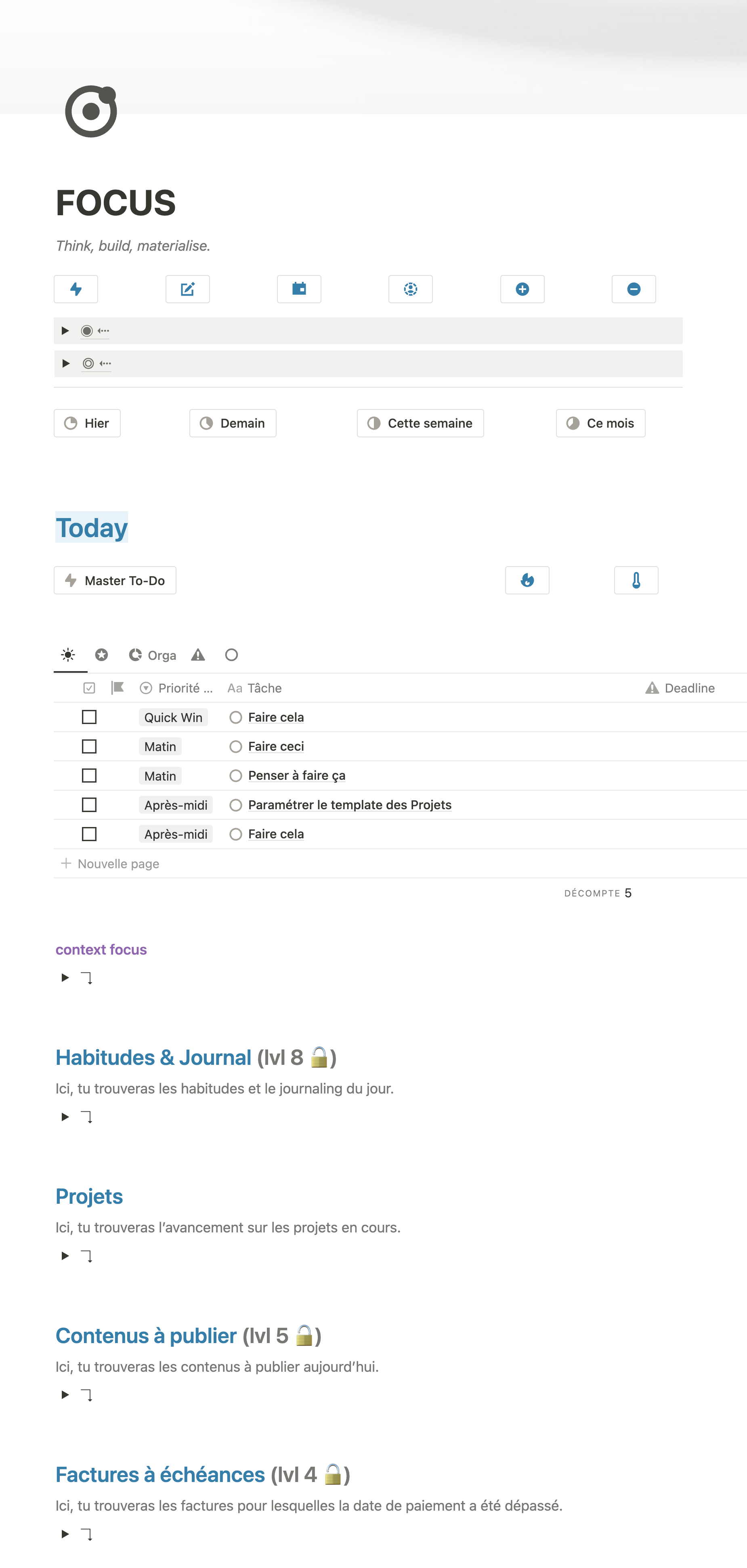 đ Identifie tes vraies prioritĂ©s, aligne tes aspirations de vie avec tes actions quotidiennes, active une concentration massive, brise tes veilles habitudes et crĂ©e des boucles de rĂ©troaction pour la croissance.