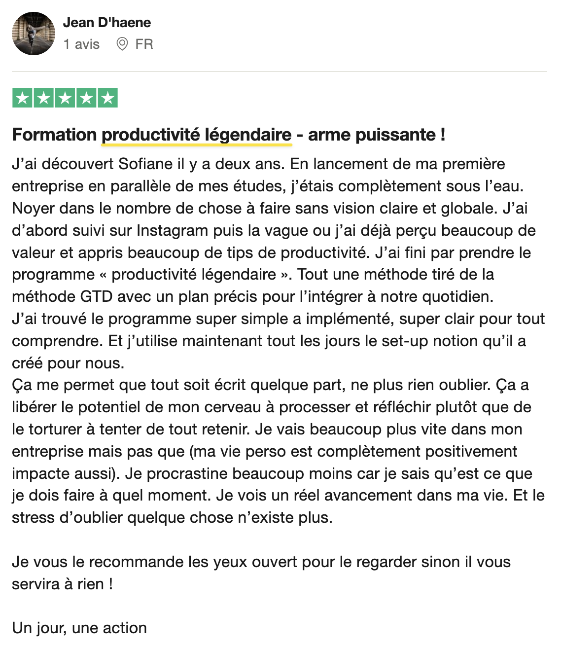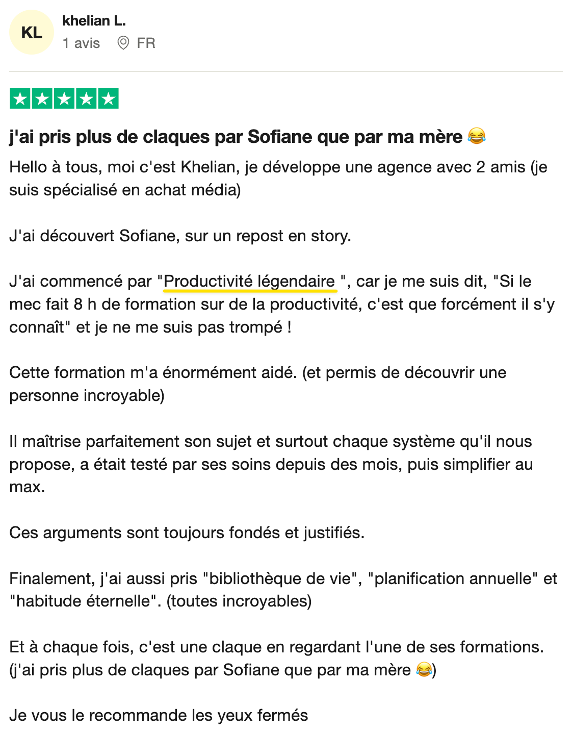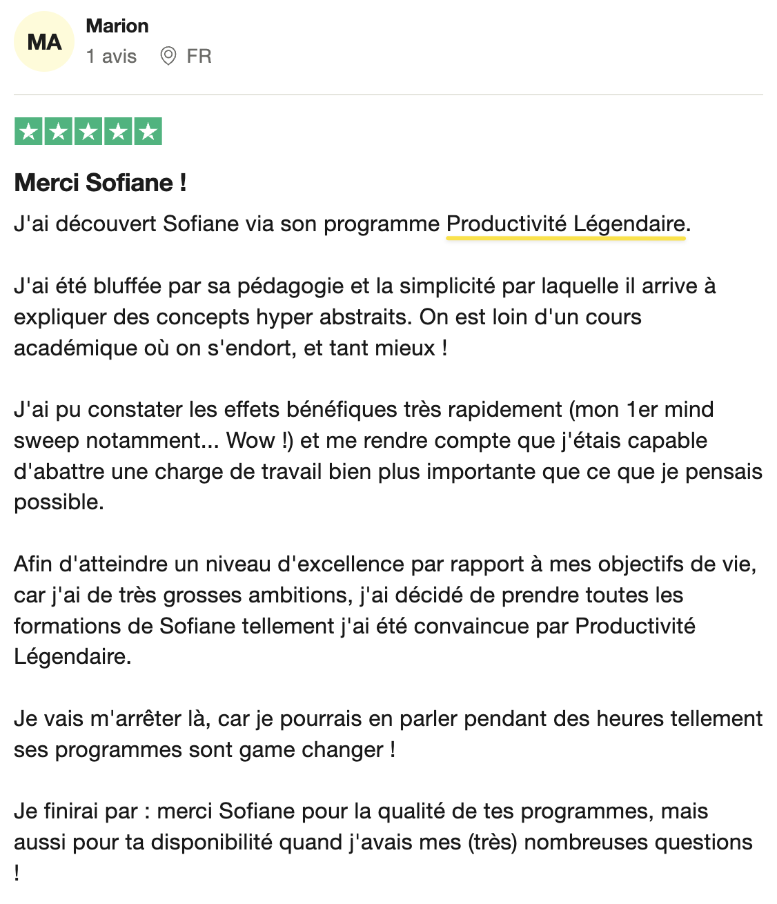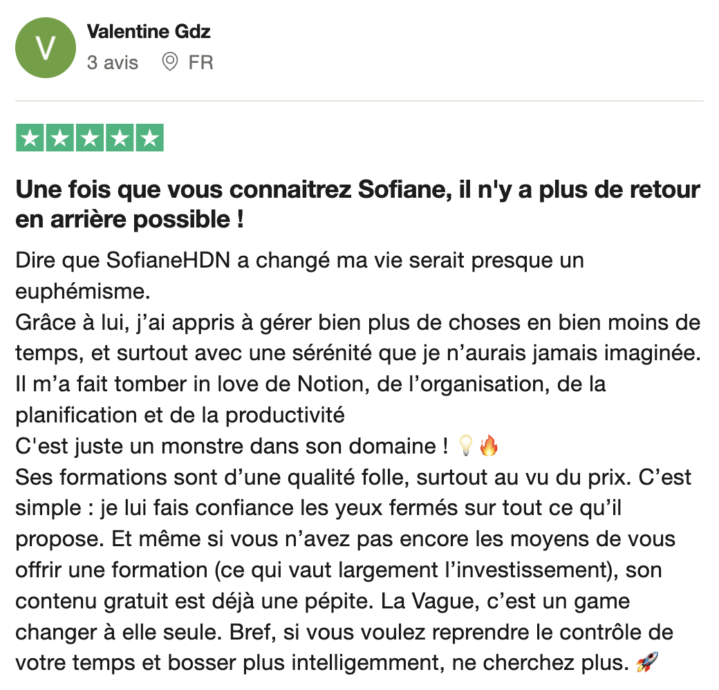 « Ça m’a permis de beaucoup mieux organiser mon temps, mes projets, mes tâches et donc, forcément, de scaler mon business beaucoup plus rapidement. Je recommande à 100%. Faites-lui confiance, vous le regrettez pas. »