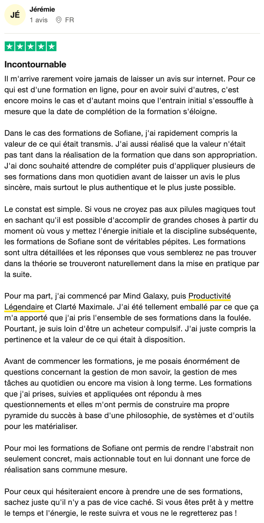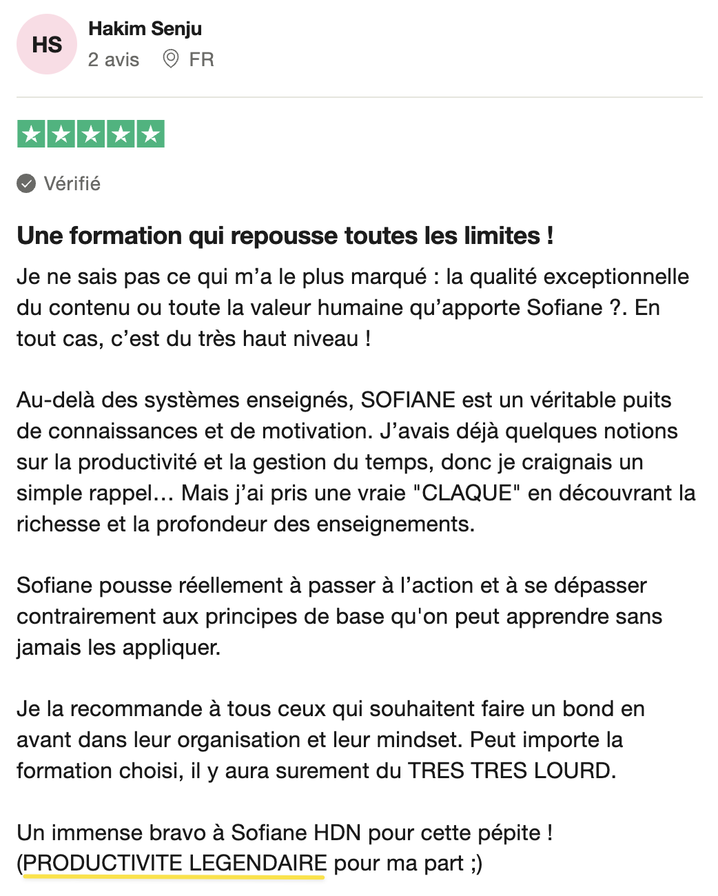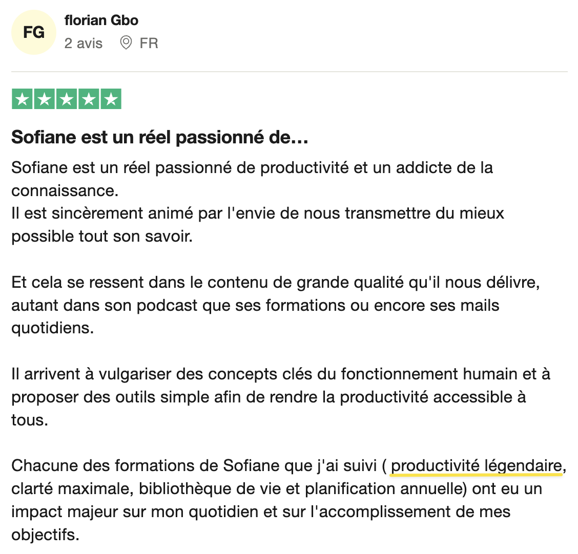 « Ça m’a permis de beaucoup mieux organiser mon temps, mes projets, mes tâches et donc, forcément, de scaler mon business beaucoup plus rapidement. Je recommande à 100%. Faites-lui confiance, vous le regrettez pas. »