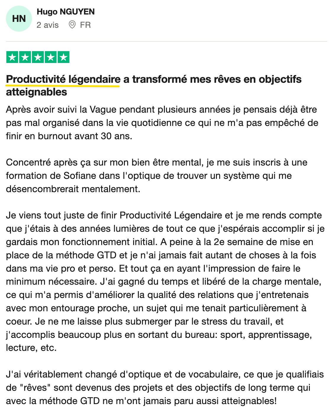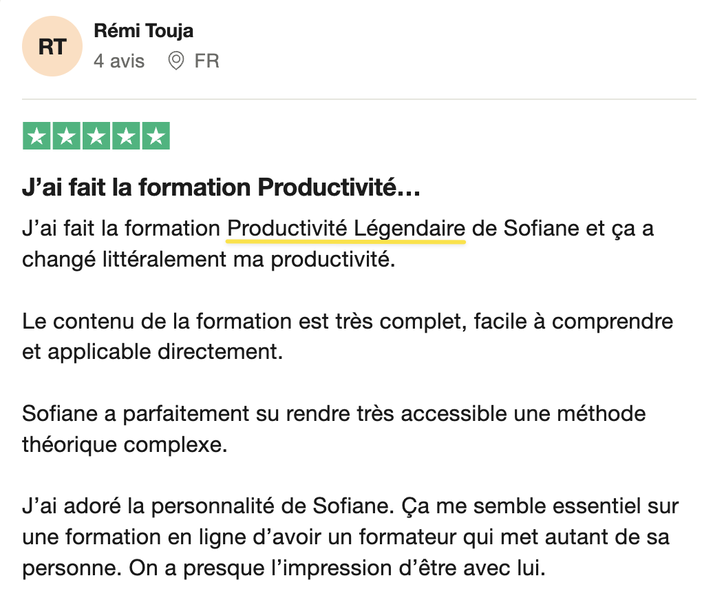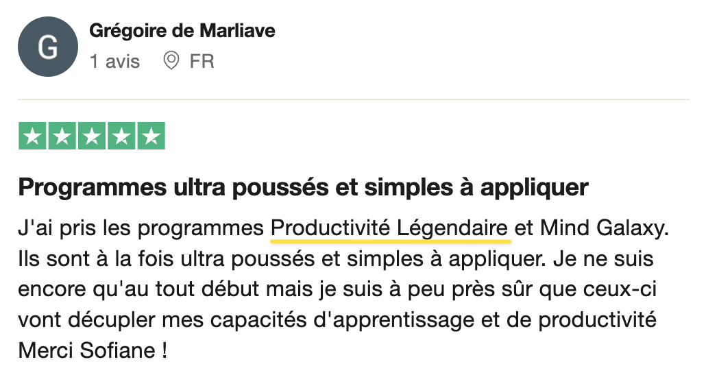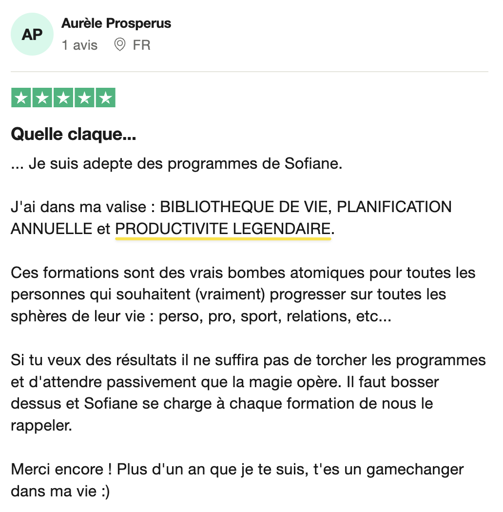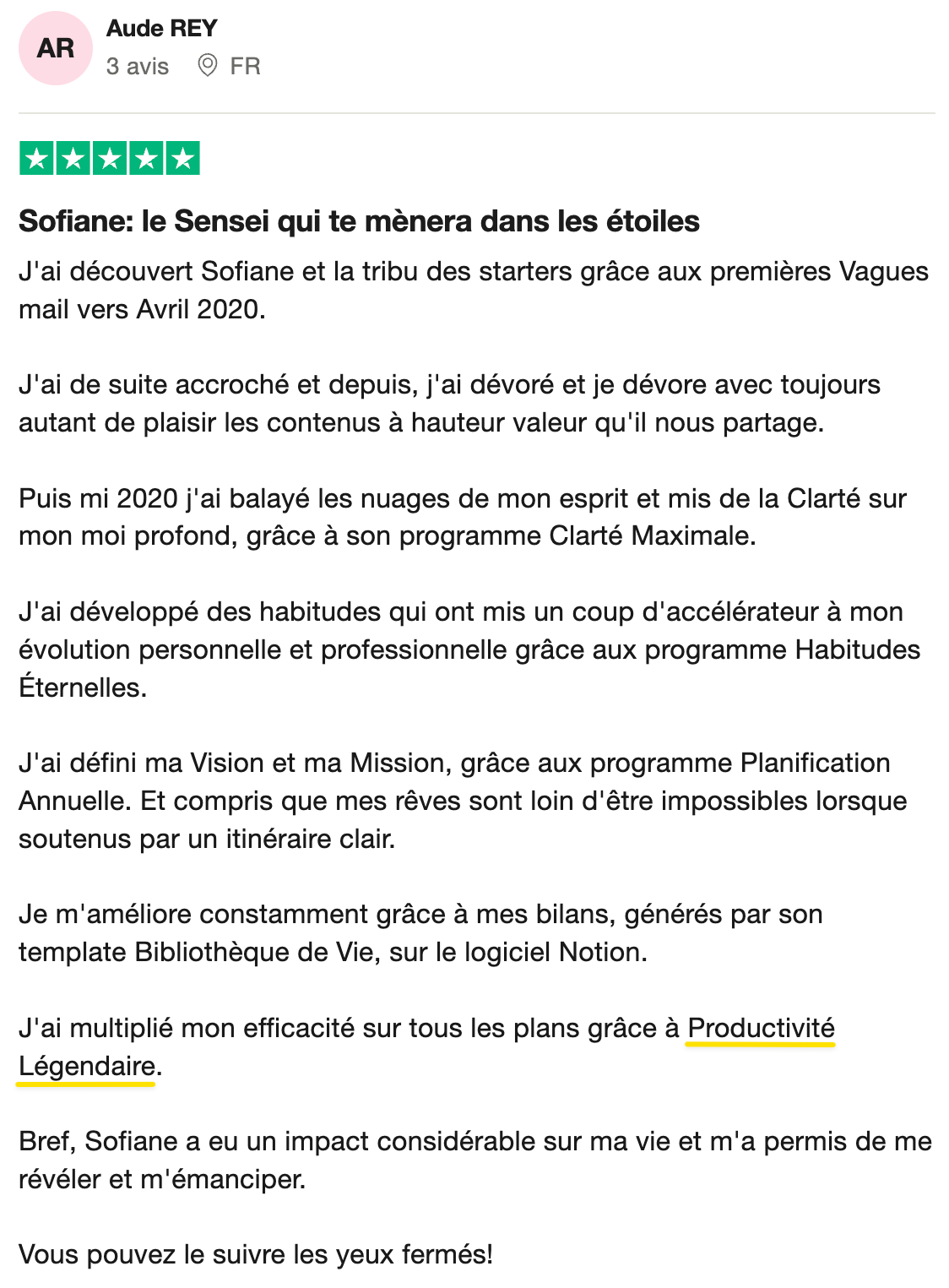 « Ça m’a permis de beaucoup mieux organiser mon temps, mes projets, mes tâches et donc, forcément, de scaler mon business beaucoup plus rapidement. Je recommande à 100%. Faites-lui confiance, vous le regrettez pas. »